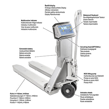 AISI 304 stainless steel pallet truck scale, suitable for use in moderately wet environments. Also available in a legal for trade approved version. Manufactured, calibrated and adjsuted in Italy by Dini Argeo, using certified sample weights.